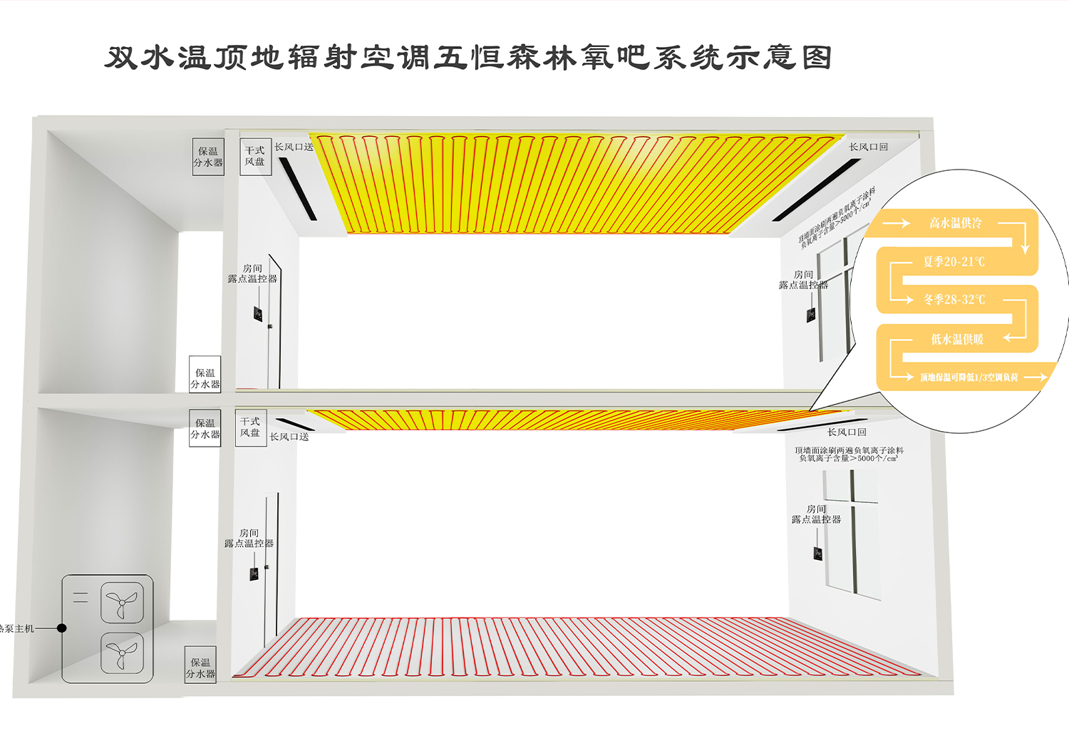 五恒森林氧吧系统高温供冷.低温除湿,辐射对流比>60%,体感舒适度极佳,顶墙采用负氧离子涂料,负氧离子浓度≥5000个/cm³,达到国家康养小镇的建设标准,分解甲醛和烟味、空气清晰,大幅提高全家人的睡眠质量,且可即装即住。本文重点解析双水温顶地辐射空调五恒森林氧吧系统的配置方案。2025-09-10 09:36:00