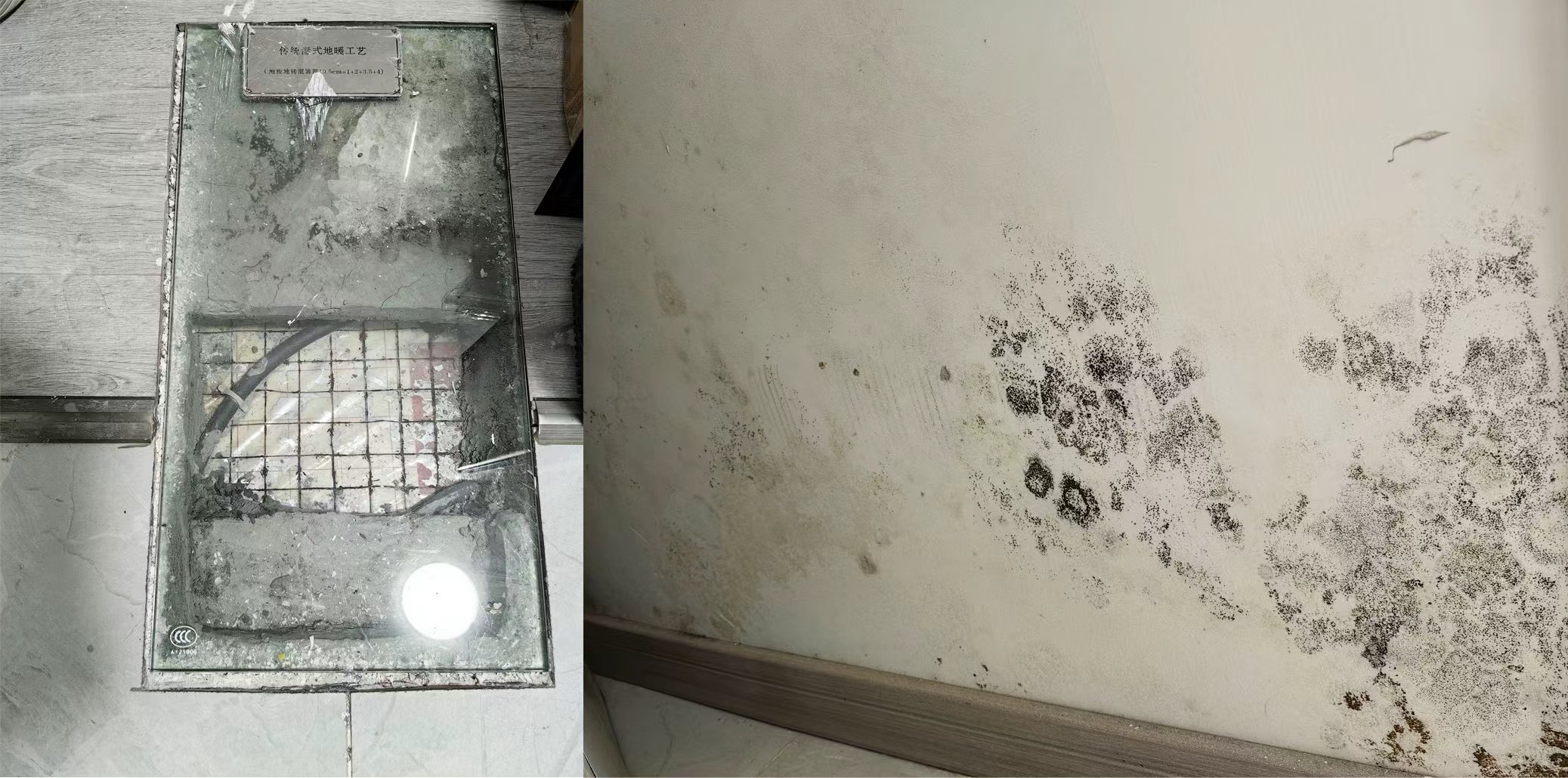 3、水泥回填层蓄冷导致地板含水量超标霉变隐患:水泥回填层在长时间低温蓄冷时,会吸收地暖管外壁凝露水和空气中水份,大幅提高地面含水量,导致地板含水量超标而出现返潮霉变、墙根发霉、地砖松动等现象。