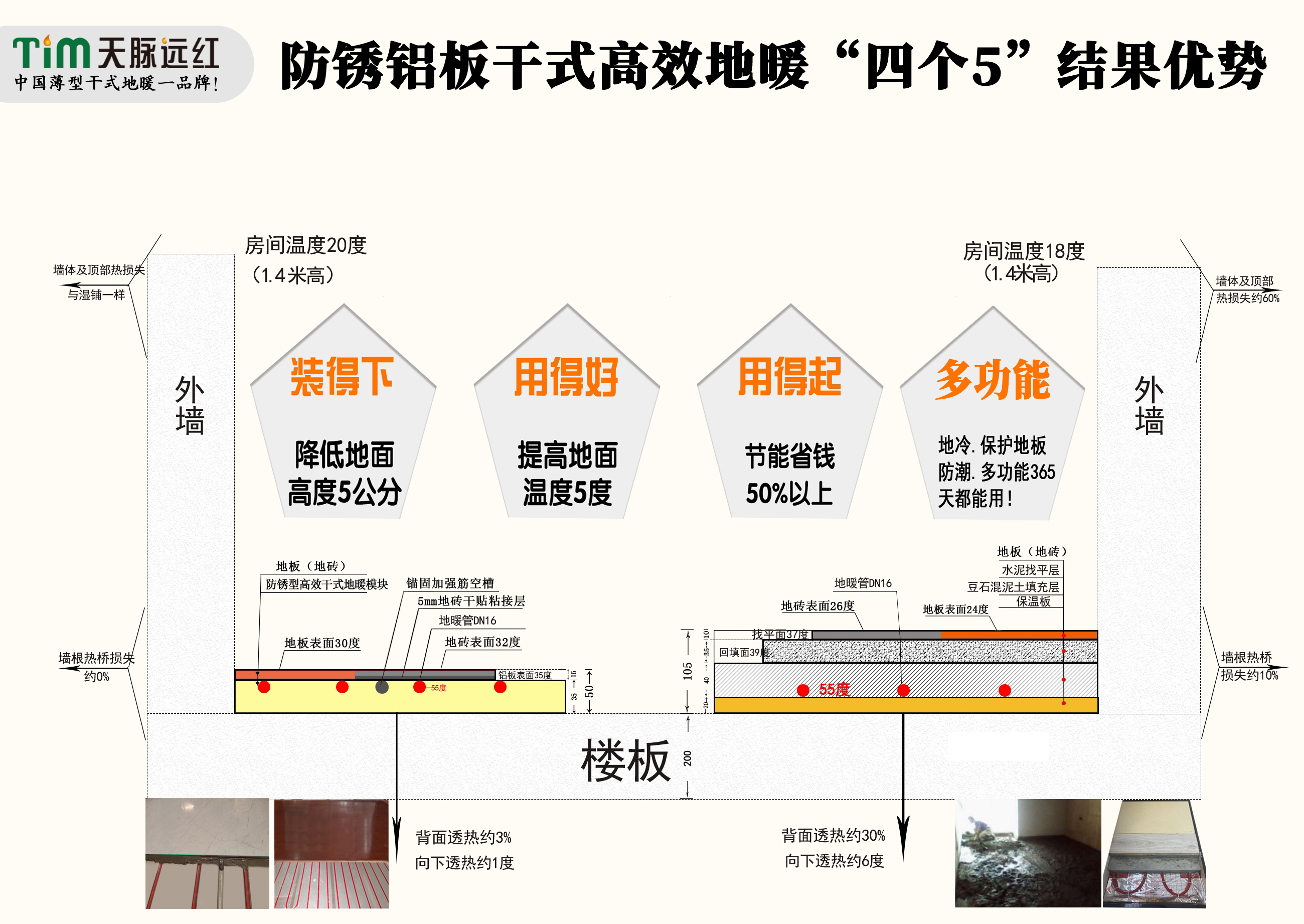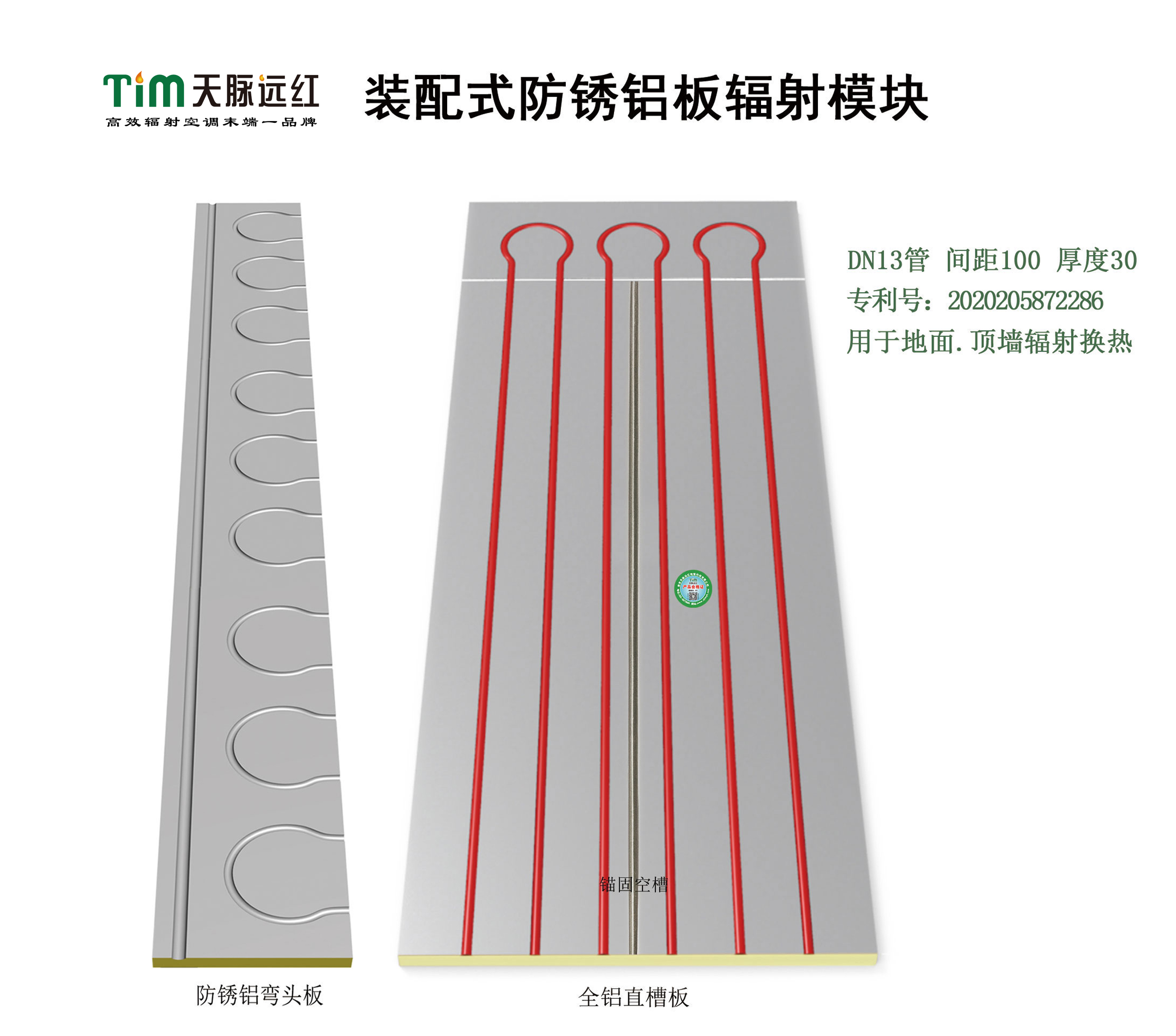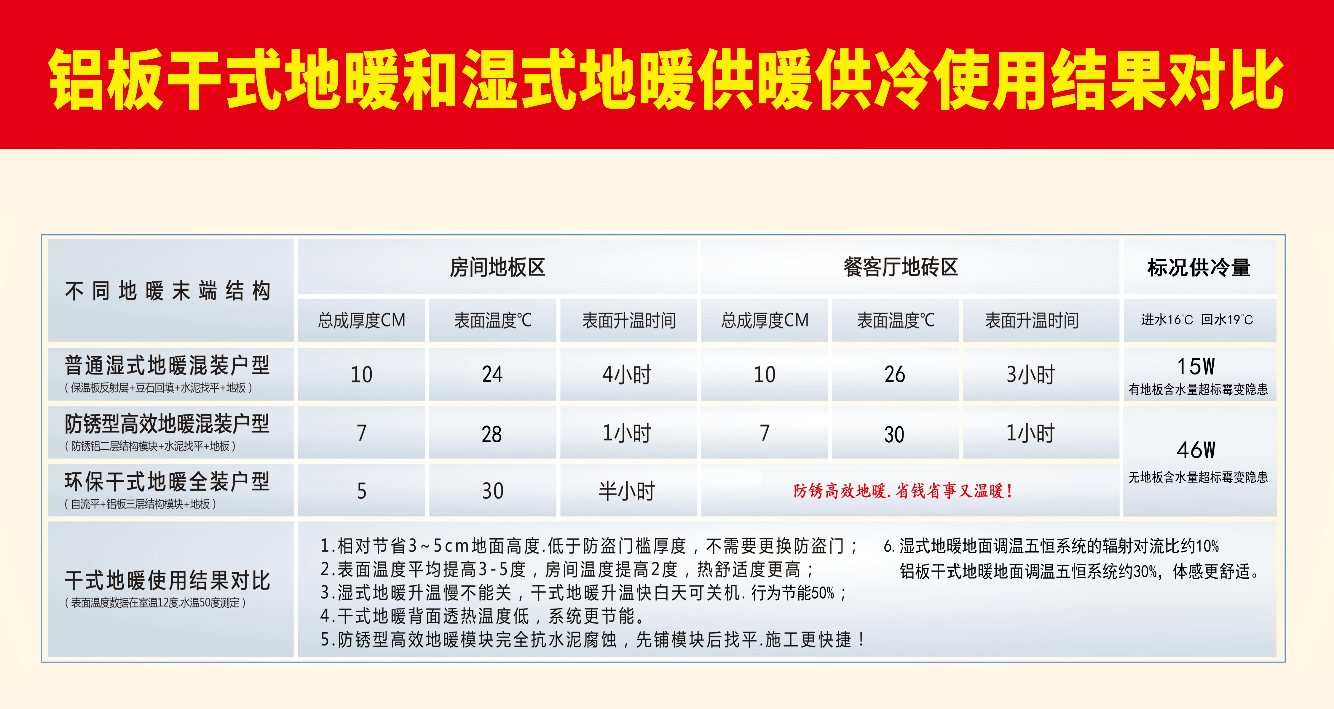 采用防锈合金铝板和高密度环保挤塑板沟槽复合而成,模块厚度3cm,采用大面积.单管槽.万能盘管结构设计,抗压强度25吨/㎡,防锈合金铝板抗水泥腐蚀,表面增加氟碳涂层,提高与水泥附着力和粘接强度,模块中间预留1根锚固空槽,让水泥下沉到空槽底部1.8cm,形成地面板樑牢固结构,表面可湿贴、薄贴或干贴地砖,总成厚度5-7cm,或表面自流平后铺地板,原地面不需要找平,简单整平即可。全铝板均热+薄水泥蓄热,标况供热量高达146W,比普通湿式地暖提高60%,标况供冷量达46W,比普通湿式地暖提高约3倍。地暖效果好、地面调温供冷量大、施工简便、无地砖松动和地板响声、霉变等隐患、升温快可即开即用行为节能一半费用!尤其适用于分户式高效地暖.两联供及地面调温五恒系统等场合。