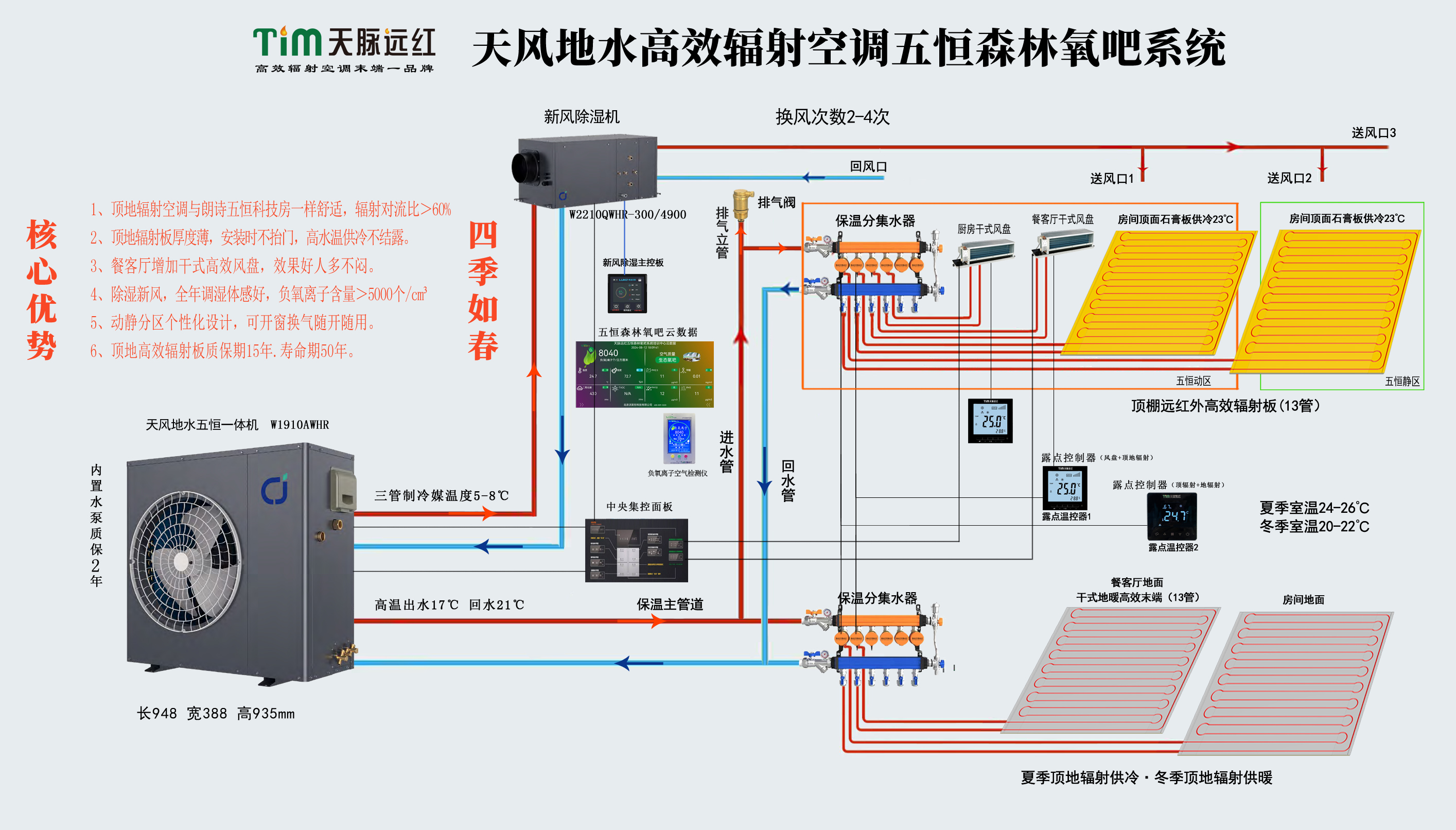 8、提高健康人居环境品质:地面调温三恒五恒空调具有良好的微风循环空气流组织,无空气交叉感染和漏氟隐患,如配合负氧离子涂料,负氧离子浓度大于5000个/cm3,达到国家康氧小镇森林氧吧的标准,会让人神清气爽,大幅提高睡眠质量!相对普通氟空调,大幅提高了健康人居环境品质。