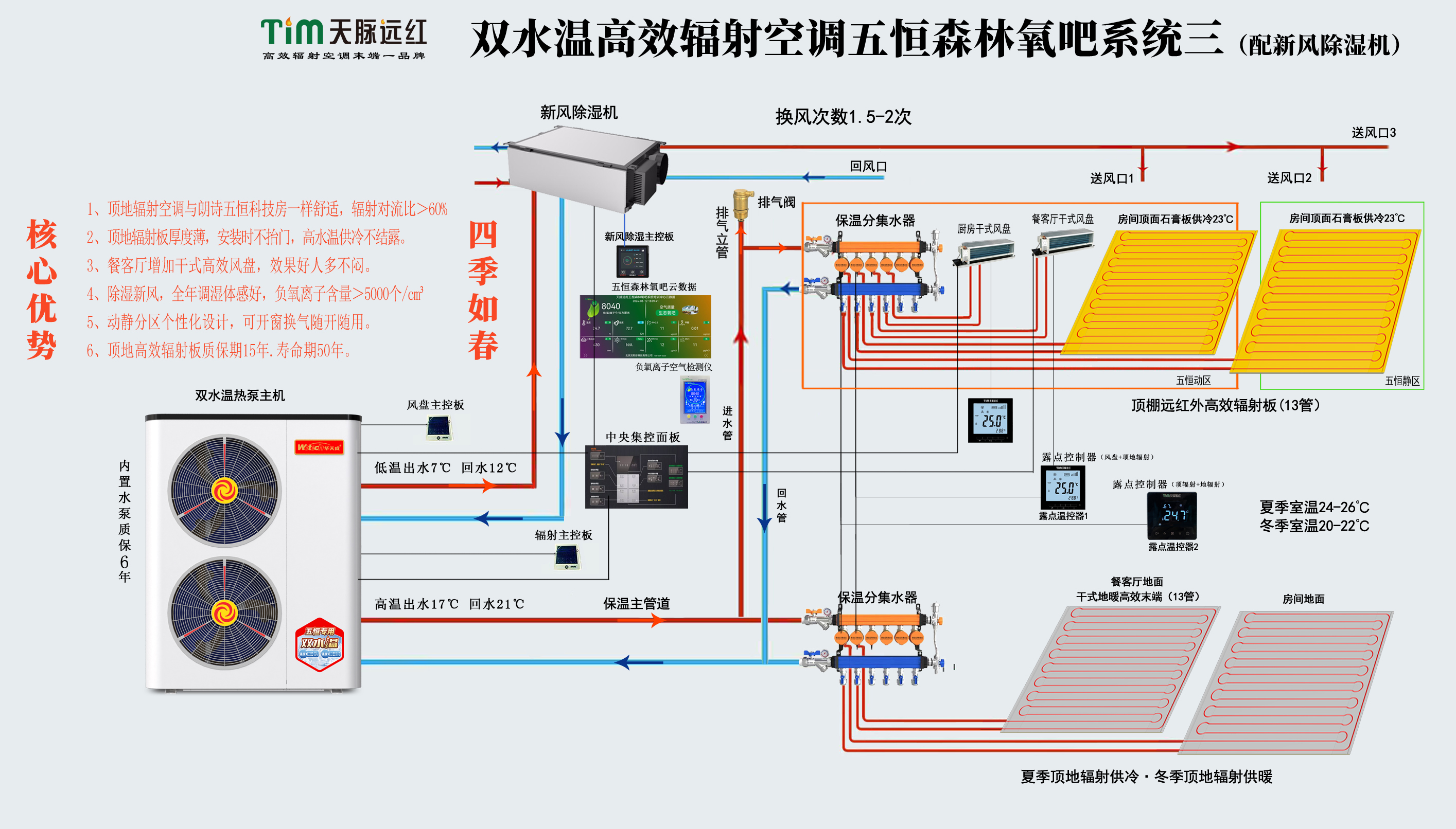 8、提高健康人居环境品质:地面调温三恒五恒空调具有良好的微风循环空气流组织,无空气交叉感染和漏氟隐患,如配合负氧离子涂料,负氧离子浓度大于5000个/cm3,达到国家康氧小镇森林氧吧的标准,会让人神清气爽,大幅提高睡眠质量!相对普通氟空调,大幅提高了健康人居环境品质。