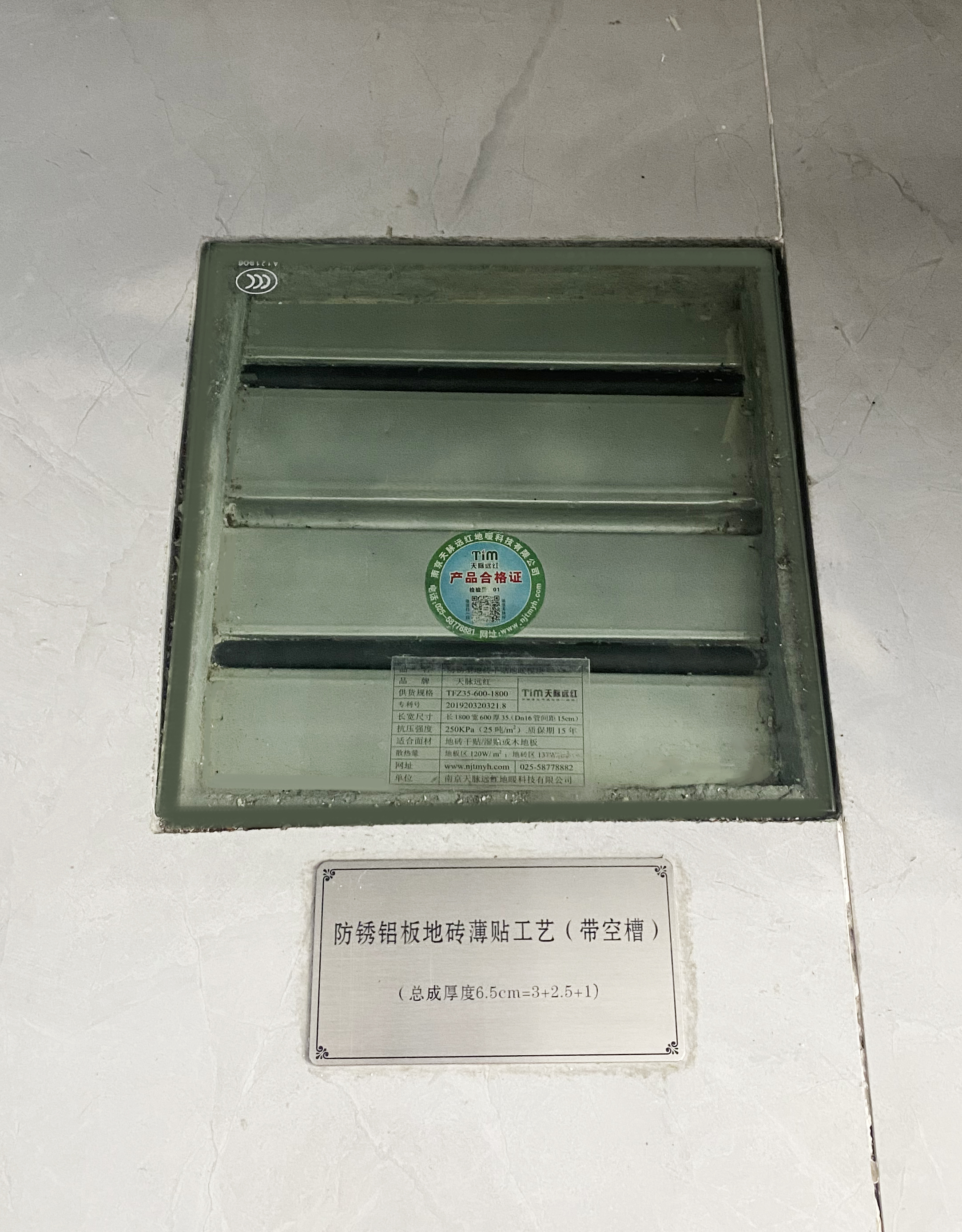 4、辐射供冷无结露隐患:铝板干式地暖无回填.热惰性小.冷热反应快,有利于精准控温,18℃以上高水温供冷,地板区地暖管外壁没有冷凝水无结露隐患,地砖区不会改变水泥粘接层的含水量,没有含水量超标地砖松动隐患,相反,利用防锈铝板干贴地暖模块的锚固空槽结构,可长期消除地砖松动隐患。