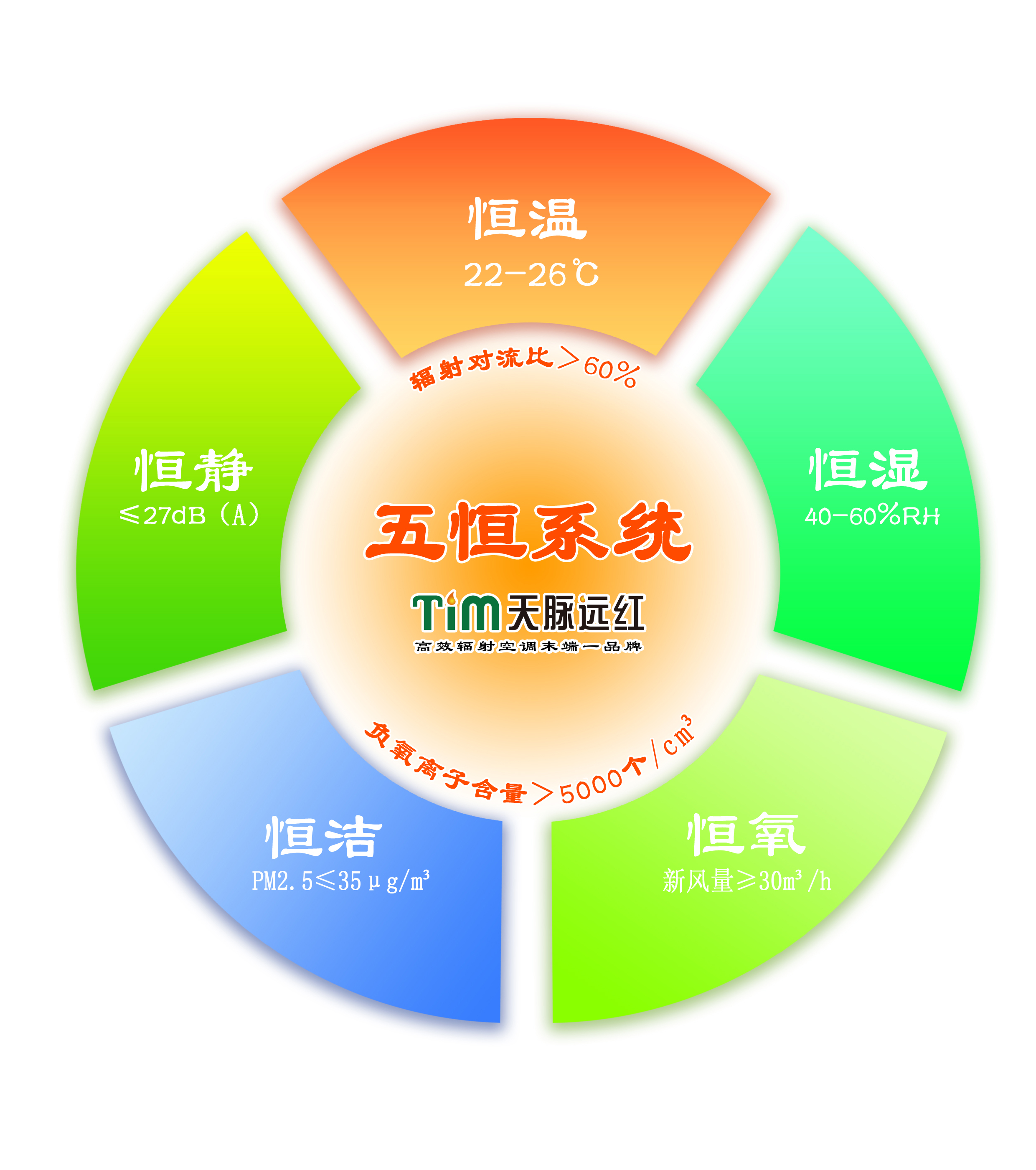 采用先进的暖通和负氧离子技术,实现以辐射为主、对流为辅的分户式顶地辐射空调系统,配合直膨式新风除湿空气处理系统,可实现室内恒温、恒湿、恒氧、恒静、恒洁的健康人居环境系统。负氧离子含量>5000个/cm³达到森林氧吧标准;其辐射对流比>60%,与人体的辐射对流散热比相当,体感舒适度极佳,高于集中式毛细管五恒科技房。